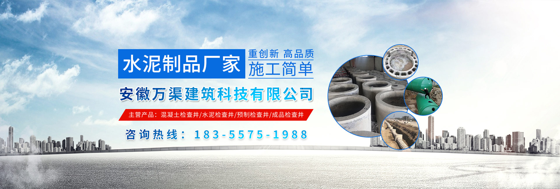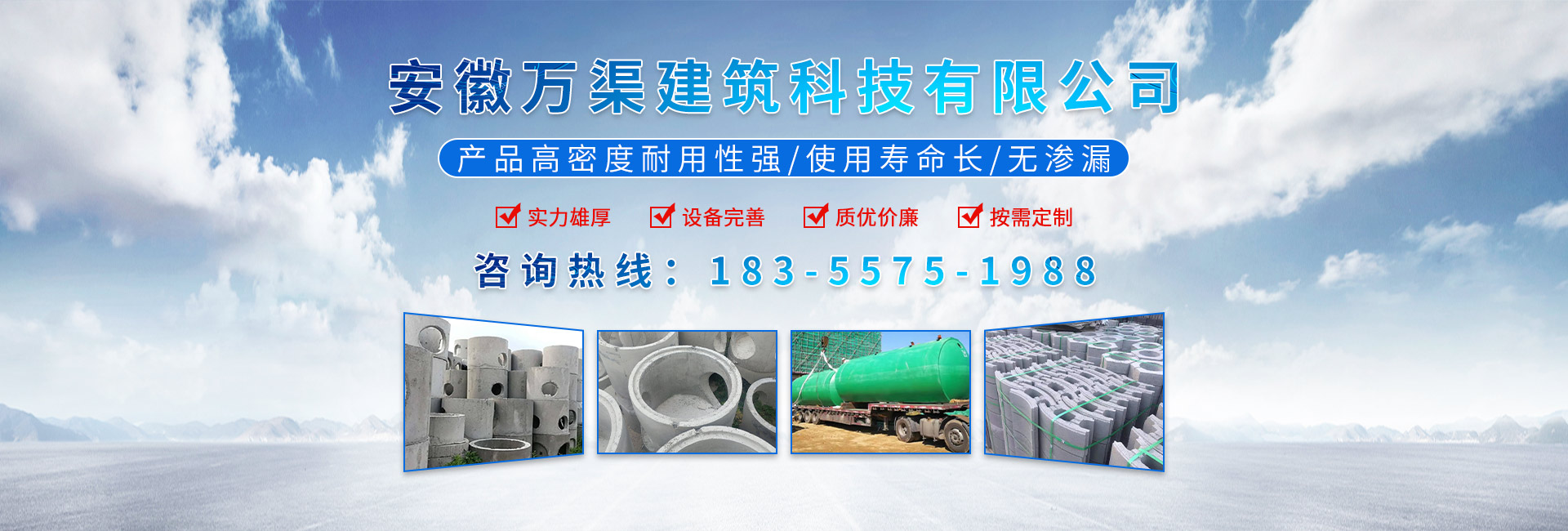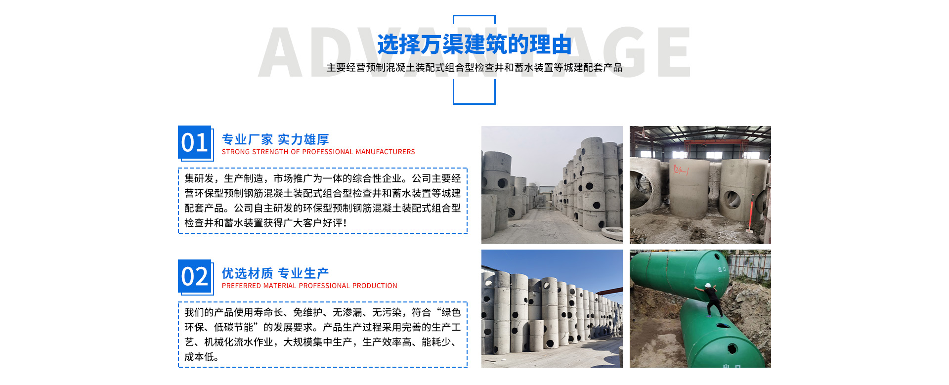 安徽萬渠建筑科技有限公司是集研發(fā),生產(chǎn)制造,市場(chǎng)推廣為一體的綜合性企業(yè)。公司主要經(jīng)營(yíng)環(huán)保型預(yù)制鋼筋混凝土裝配式組合型檢查井和蓄水裝置等城建配套產(chǎn)品。產(chǎn)品生產(chǎn)過程采用獨(dú)特的生產(chǎn)工藝,機(jī)械化流水作業(yè)。產(chǎn)品大規(guī)模生產(chǎn),生產(chǎn)效率高,耗能少,成本低,產(chǎn)品使用壽命長(zhǎng)、免維護(hù)、無滲漏、無污染,符合“綠色環(huán)保,低碳節(jié)能”的發(fā)展要求,是傳統(tǒng)磚砌井池的理想替代產(chǎn)品。
